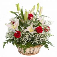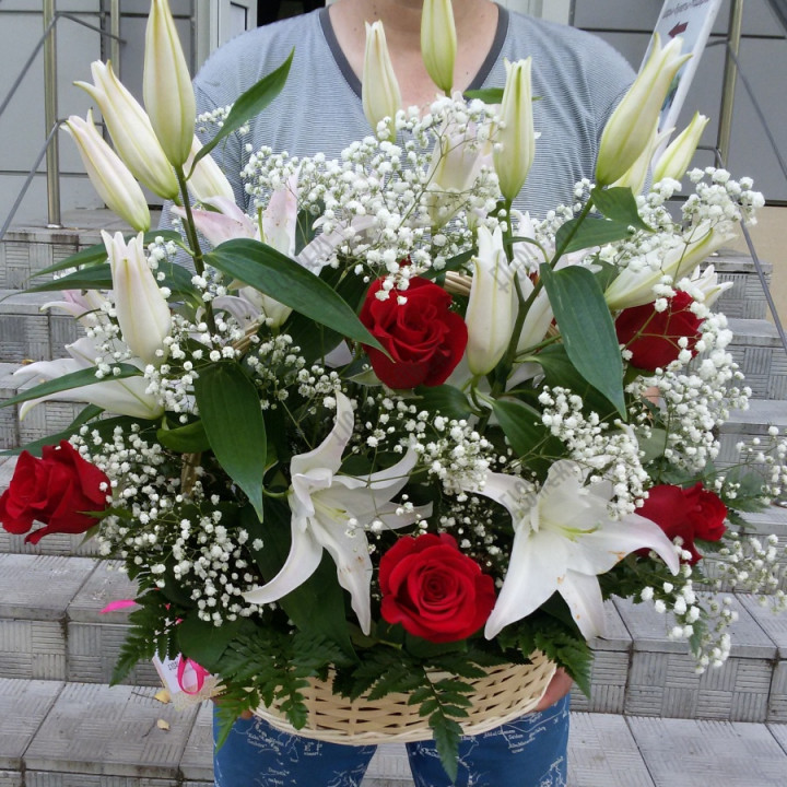 3 лилии, 7 роз, 4 гипсофилы, зелень, биофлор, корзина