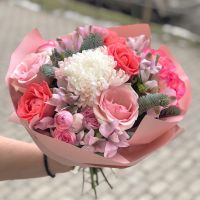 5 роз, 10 кустовых роз, лизиантус, зелень, упаковка